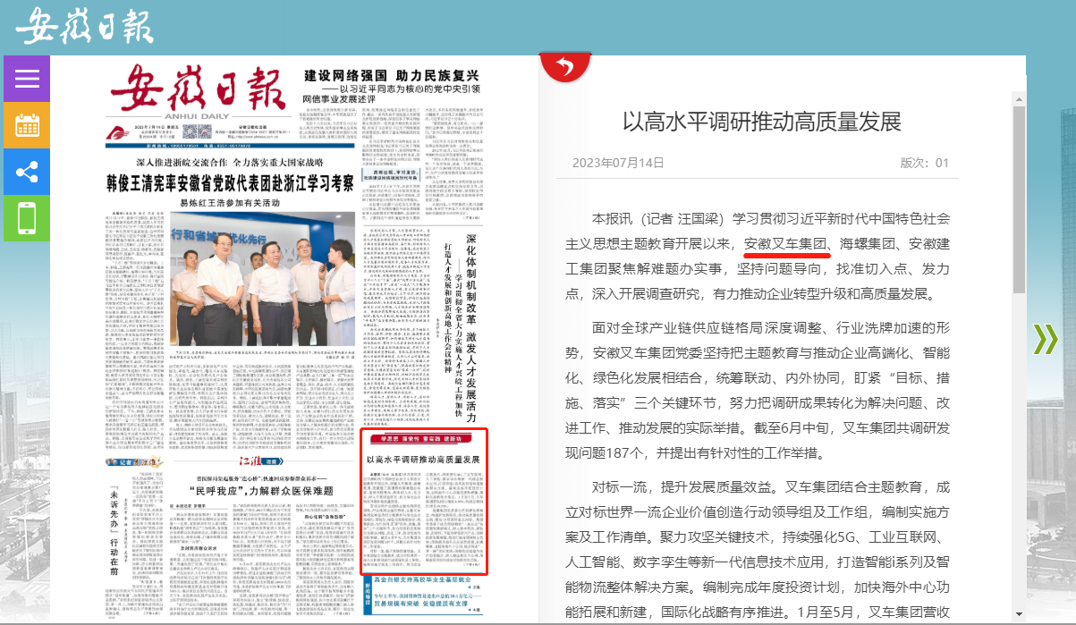 7月14日,《安徽日報》在頭版中就安徽叉車集團(tuán)以高水平調(diào)研推動高質(zhì)量發(fā)展情況進(jìn)行了報道。報道中表示,學(xué)習(xí)貫徹習(xí)近平新時代中國特色社會主義思想主題教育開展以來,安徽叉車集團(tuán)聚焦解難題辦實事,堅持問題導(dǎo)向,找準(zhǔn)切入點(diǎn)、發(fā)力點(diǎn),深入開展調(diào)查研究,有力...